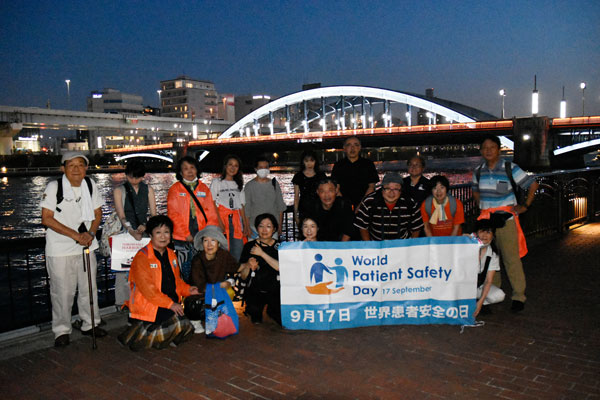 9月17日「世界患者安全の日」に合わせて、原告の会では、ライトアップされた隅田川(東京)にかかる橋を見ながら歩く「隅田川橋梁ライトアップ見学ツアー」を行いました。